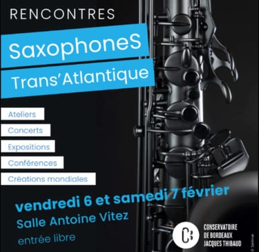 ĂvĂ©nement exceptionnel qui se dĂ©roulera les 6 et 7 fĂ©vrier 2026 Ă Bordeaux, salle Vitez et CRR de Bordeaux. Plus de 400 saxophonistes se croiseront lors des scĂšnes publiques. Programme Ă consulter sur le site : Rencontres SaxophoneS TransâAtlantique | Conservatoire de Bordeaux
